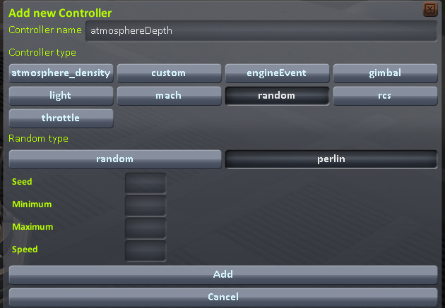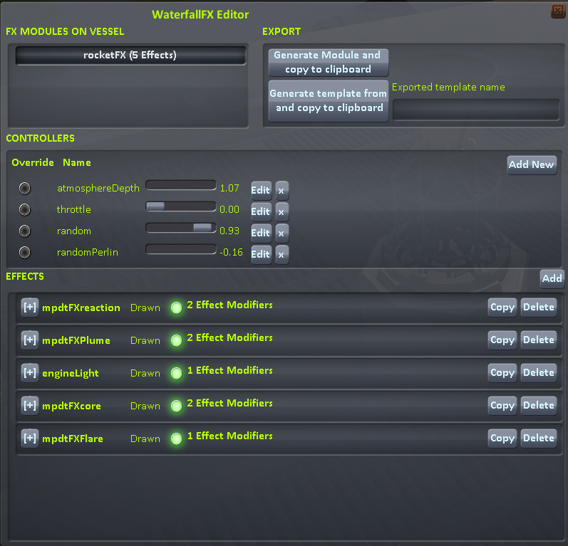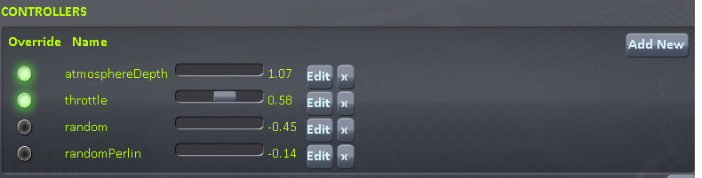 Each Controller can be overridden from the UI by clicking the toggle beside it. You can then use the sliders to adjust the input sent to the effects to test out different throttles or atmospheric conditions. Click the toggle again to return control to the game.