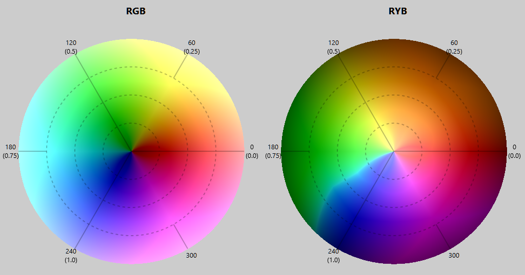 Regarding the RYB conversion: One thing I didn't worry about was where the Cyan color ended up while applying the HUE transformation. As we said: (ForwardHUEtransform) Yellow goes from 60 to 120 degrees. Green goes from 120 to 180 degrees. And so does Cyan from 180 to 216 degrees. And perhaps it's "squashed" too much. (I don't know the consequences of this.)