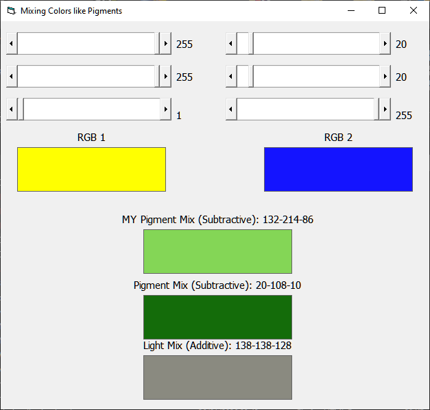 I've been looking for a way to convert the color space from RGB (additive) to RYB (subtractive) for a while. This is because if we want to mix Yellow with Blue, using RGB we get Gray, while, in reality, if we use brushes on a canvas, we get a Green color. Yellow RGB = (1,1,0) Blue RGB (0,0,1) Mixed = (0.5, 0.5, 0.5) = Gray. The internet is full of resources ranging from using equations to trilinear interpolations of the 8 vertices of cubes corresponding to the RGB and RYB color spaces. However, none of these methods really satisfied me, and the conversions were not one-to-one. That is, converting any RGB color to RYB and then converting it back from RYB to RGB did not yield the original color.