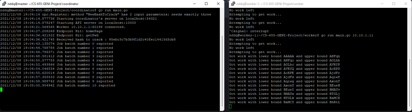 sudo wget https://raw.githubusercontent.com/nddq/CS-655-GENI-Project/main/worker.sh. Run the script usingsh worker.sh cdinto the worker folder and rungo run main.go 10.10.<worker number>.11to connect to the coordinator server. After a worker node is connected, a log should be output to the coordinator's terminal.