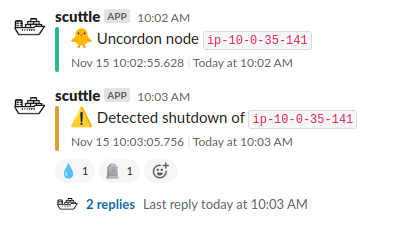 scuttle integrates with Slack to post shutdown lifecycle events. Stay informed about spot terminations, shutdowns, drains, deletions.