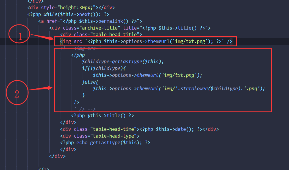 3、找到index.php和archive.php文件。把下图1部分代码删掉或注释,然后把2部分代码取消注释。