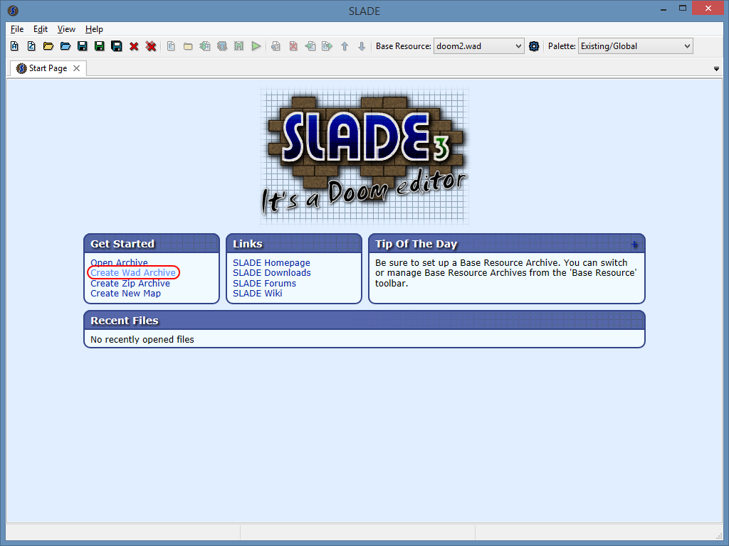 Now we will need to create an archive (wad) to contain the map. It is possible to create a map without performing this step first (via File → New Map), but for the purposes of this tutorial we will be doing it this way, to show how to create new maps in existing archives. As we have not opened anything yet, the start page should be showing. Click on the Create Wad Archive link, and a new tab will open for the new, unsaved wad archive. If the start page isn't showing or you have it disabled, you can create an archive by clicking